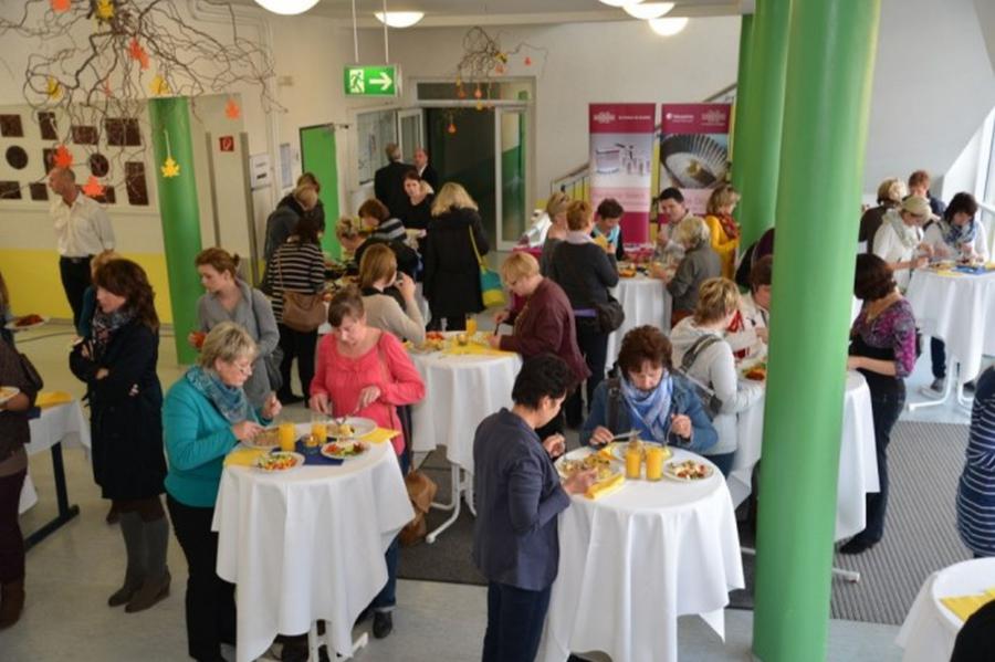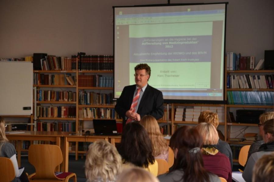 Während des wissenschaftlichen Programms für die Zahnärzte in der Aula bildeten sich die zahnärztlichen Fachangestellten in der Bibliothek der Schule weiter. Herr Becker zeigte in seinem Vortrag „Infektionsprävention in der Zahnheilkunde – Anforderung an die Hygiene“ die modernen, zahlreichen Möglichkeiten für die Praxis. Im zweiten Vortrag von Herrn Martenson wurde erneut die zentrale Rolle des Patienten „als willkommener Gast und Kunde“ herausgestellt.
