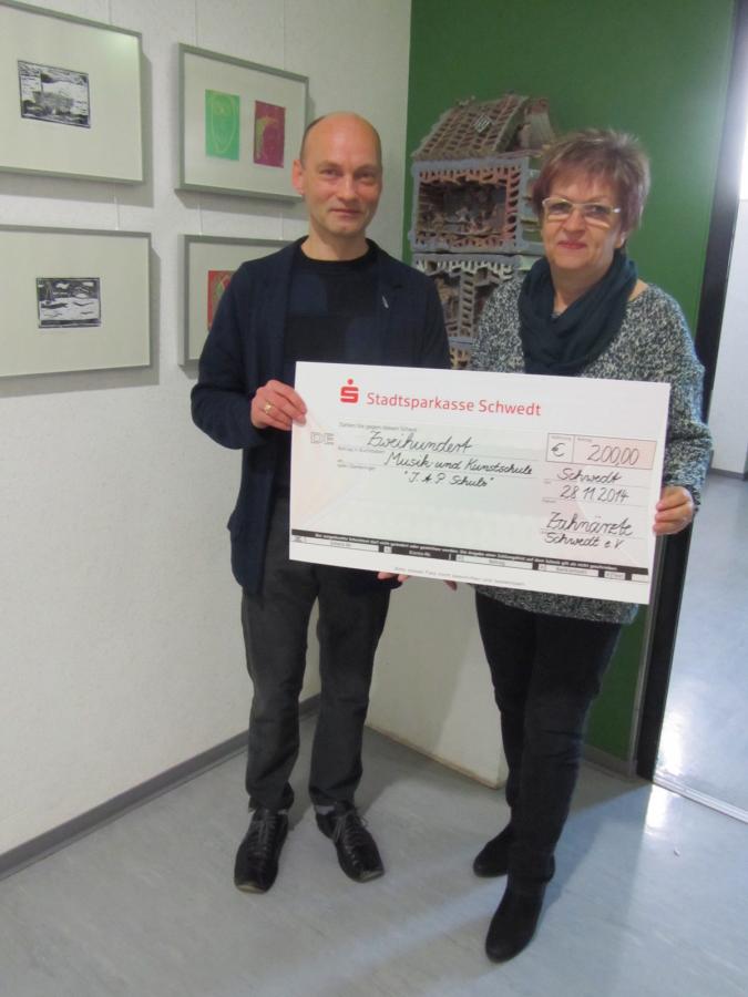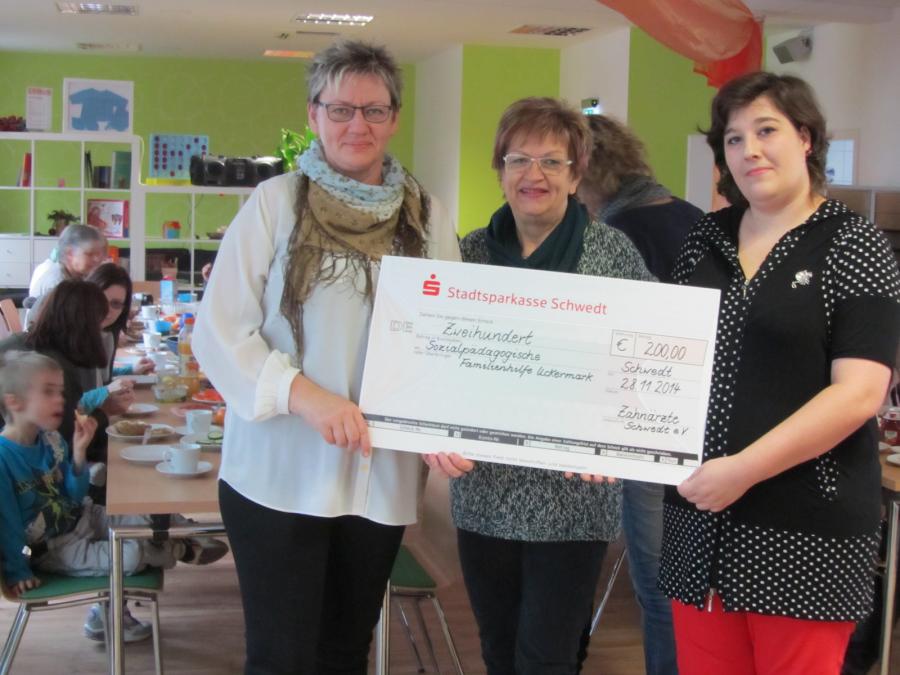 Zum Ende des Jahres 2014 konnten wir als Verein einige Projekte mit diversen Geldspenden unterstützen. So gingen 200 € an die Musik- und Kunstschule Schwedt, 200 € an das Gauß- Gymnasium für ein Head-Set sowie 200 € an die Volkssolidarität, welche 100 € für das Familienfrühstück und 100 € für Gutscheine für Familien-Eintrittskarten in das Theater Stolperdraht einsetzt. Das Familienfrühstück ist ein Angebot für einkommensschwache Familien, welches einmal im Monat im Haus der Generationen angeboten wird.